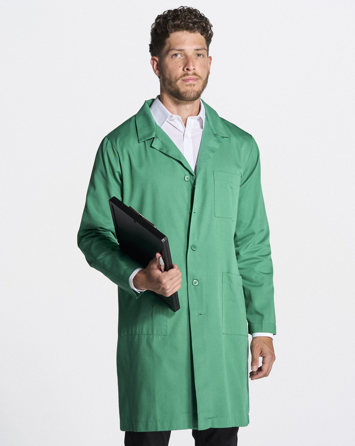 Bata de hombre. Cuello en V. Bolsillo en el pecho en el lado izquierdo y dos bolsillos delanteros en la parte inferior. Cinco botones frontales a tono. Cinturón en espalda….