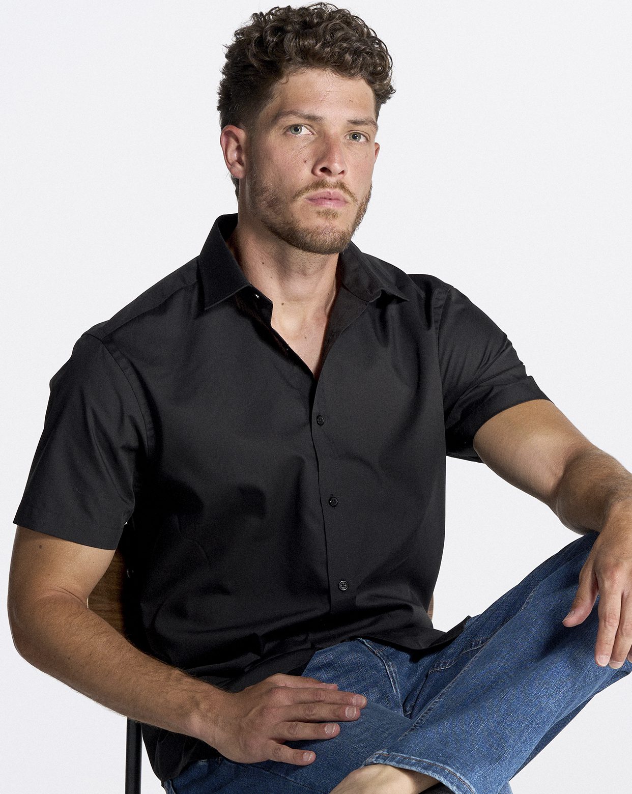 Camisa antiarrugas y antibacterias para hombre de manga corta. Entallada de manga larga, en popelín. Cuerpo ajustado. Botones a tono.