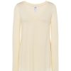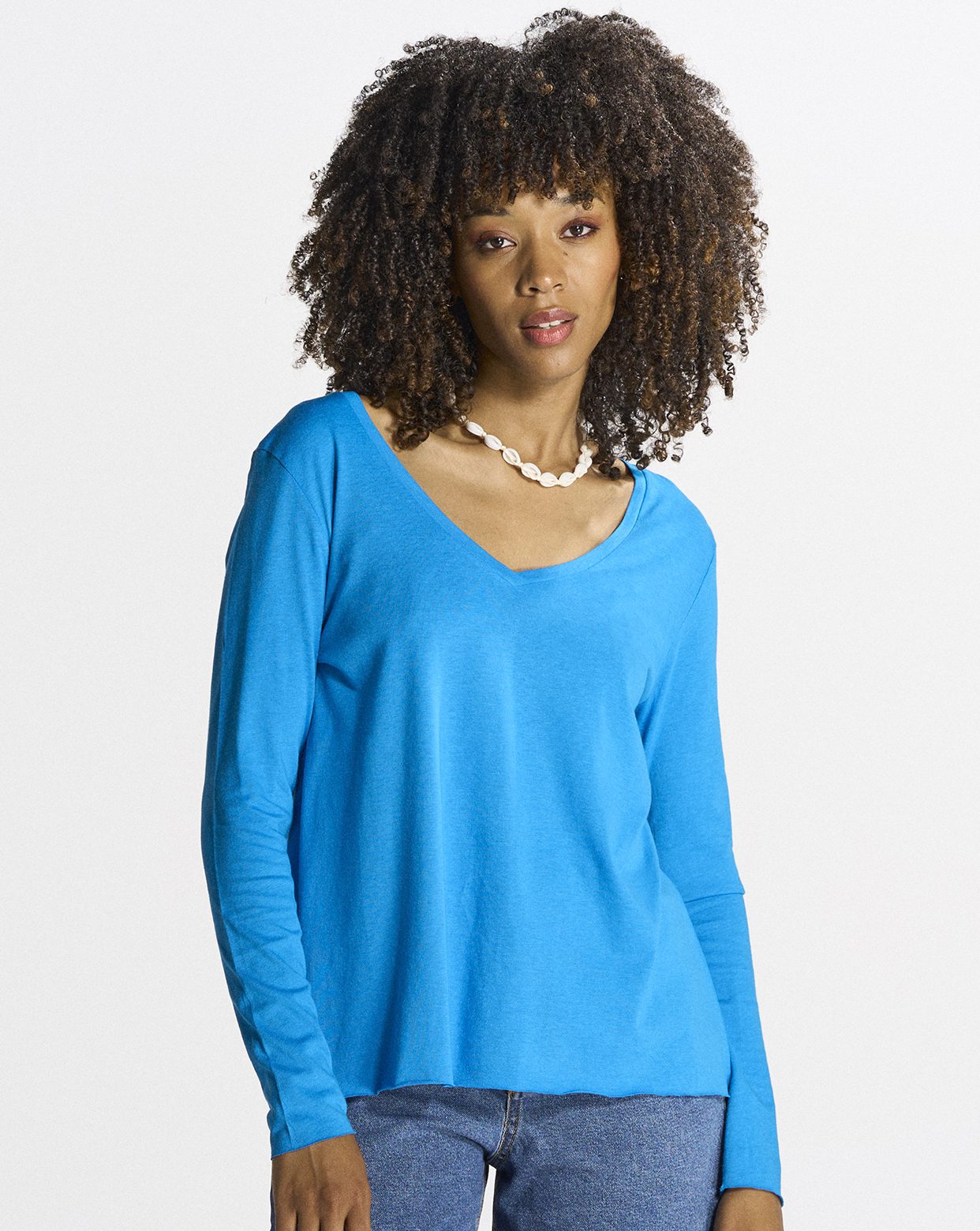 Camiseta de mujer de manga larga, cuello de pico y forma acampanada. Etiqueta removible.